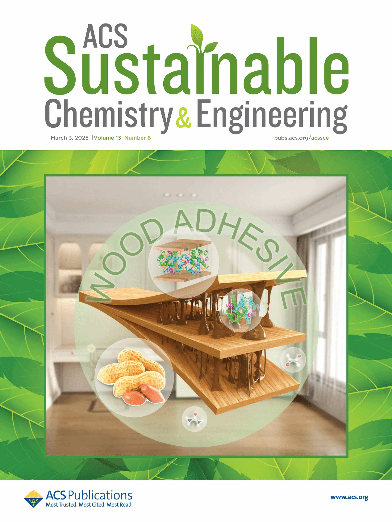 近日,公司suncitygroup太阳集团网站邓书端教授领衔的“新型木基复合材料创新团队”在国际权威期刊《ACS Sustainable Chemistry & Engineering》(中科院一区TOP,IF:7.1)上发表题为“Construction of Eco-Friendly and Water-Resistant Peanut Protein Wood Adhesive through Multiple Cross-Linking Strategies”的研究论文,并被期刊遴选为2025年13卷8期的封面论文。