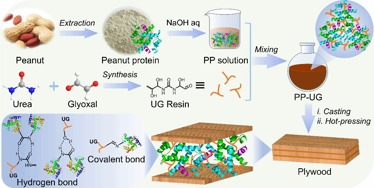 该研究成果具有重要的理论和应用价值:(1)该胶黏剂环保性能优异,解决了传统胶黏剂的甲醛释放问题;(2)制备工艺简单,易于工业化生产;(3)为农林废弃物花生粕的高值化利用开辟了新途径。花生粕是花生仁在高温提取花生油后产生的副产物,由于其中的黄曲霉毒素含量经常超过监管标准而被废弃。中国每年约产生400万吨花生粕,而花生粕中蛋白质含量较高,对其进行开发利用能实现废弃资源的变废为宝。