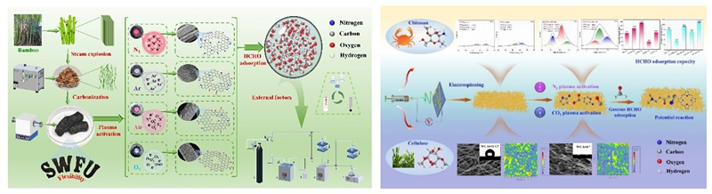 研究成果一:针对我国室内气态甲醛超标所导致的人居空气质量下降问题,团队带着人徐开蒙教授等以滇产竹材为原料,采用蒸汽爆破-高温碳化联合处理构建具有气态甲醛物理吸附性的柔性多孔竹基微米纤维;以纤维素、壳聚糖为原料,采用静电纺丝构建复合多孔纳米纤维膜,通过不同气氛下的绿色无污染的低温等离子体改性增强微纳米纤维的化学吸附性,揭示气态甲醛吸附增效机理(Xu K*, Chem. Eng. J. 2023, 140686; Xu K*, Int. J. Biol. Macromol. 2023, 10.1016/j.ijbiomac.2023.128399; Xu K*, Ind. Crop Prod. 2023, 10.1016/j.indcrop.2023.117747)。