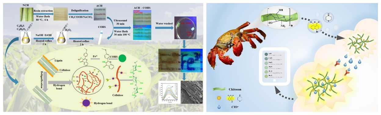 针对各类污染物低限域下难以精准检测等难题,团队成员张莲鹏教授等以生物质大分子和木本、禾本植物为原料,通过物理、化学改性,制备了一系列具有化学稳定性高,具有灵敏、高效检测性能的荧光材料,从而实现对重金属、染料分子、农药、抗生素的选择性识别和高效吸附(Zhang L*. Int. J. Biol. Macromol. 2023, 242, 124600; Zhang L*. Ind. Crop. Prod. 2024, 208, 117775)。