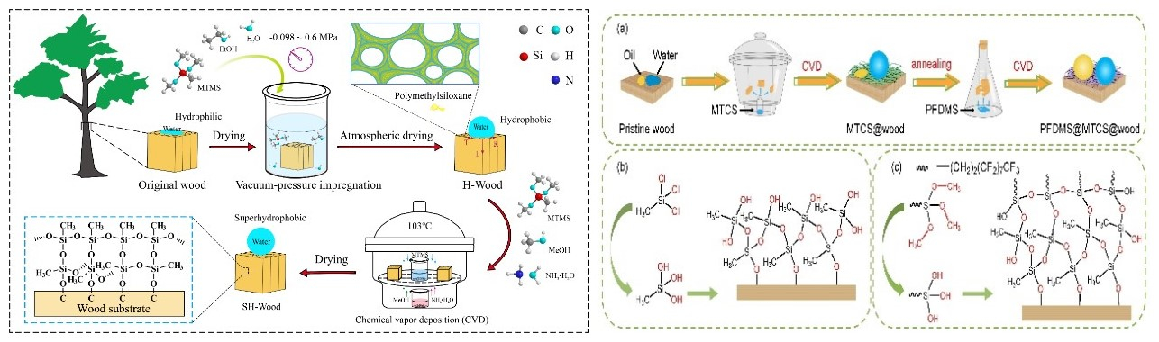 为提高木材的防水阻湿和耐油污性,团队成员解林坤教授等利用甲基三甲氧基硅烷液-气相沉积过程制备多功能超疏水木材,通过真空加压浸渍-化学气相沉积等方式实现对木材内细胞壁的充填交联和表面超疏水层构建,所制备的耐污染木材表面特性优异,制备过程简单,在木结构建筑、家具制造和室内装饰等领域具有广阔的应用前景(Xie L*. Prog. Org. Coat., 2023, 185, 107926. Xie L*. Colloids Surf. A: Physicochem. Eng. Asp., 2023, 666, 131314. Xie L* Mater. Lett., 2023, 343, 134348)。