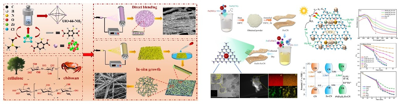 团队成员张莲鹏教授等将生物质大分子和MOF、COF材料进行原位复合,制备具有超强、特异、高选择性的吸附材料(Zhang L*, Sep. Purif. Technol. 2023, 327, 124942; Zhang L*, Mater. Today Chem., 2023, 29, 101420)。柴希娟教授等通过将α-Fe2O3量子点均匀锚定在超薄多孔Fe掺杂氮化碳纳米片表面,构建具有优异Fe(III)/Fe(II)转化效率和低金属离子浸出率的磁性非均相双光芬顿催化剂,为土霉素、抗生素废水的绿色高效处理提供了重要参考(Chai X*. J. Environ. Chem. Eng. 2023, 11, 111502; Chai X*, Diam. Relat. Mater. 2023, 140, 110440; Chai X*, Adv. Compos. Hybrid Mater. 2022, 5, 86)。