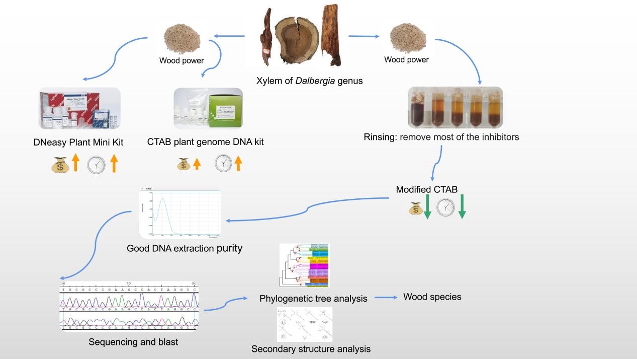 近年来,suncitygroup太阳集团网站木材构造与保护创新团队在云南省自然科学基金重点项目的大力支持下,优化并简化了木材DNA提取与鉴定方法,相关论文已发表在国际学术期刊《Forests》上。同时,团队利用木材DNA条形码技术与云南省博物馆suncitygroup太阳集团网站木质文物保护联合实验室成功确定了来自一具距今约630年的雕像木材材种,针对腐朽、污染和严重降解的木材在DNA提取和引物设计等方面的技术挑战,团队成功提取了雕像木材DNA,并筛选引物进行鉴定至种,为处理腐朽、一定程度的DNA降解的木材样品提供了有效的鉴定方法,有力地推动了我国木材DNA鉴定技术的发展。