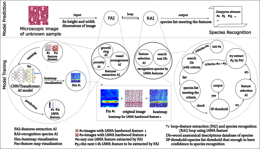 FRAI基于InsideWood中的7000多个现代阔叶树种的50000多张解剖图像,由木竹藤材构造与保护创新团队按照木材解剖构造标注了60个用于深度学习的数据集(其中分类数据26000多张,特征检测对象21000多个),进行了超过1000小时的训练。FRAI能够识别横切面、径切面、弦切面上共90个IAWA阔叶材解剖特征,例如生长轮界、导管形态、细胞壁厚薄、木射线构造和内含物等,并且能够根据识别到的解剖特征检索出未知木材样本最可能的树种。