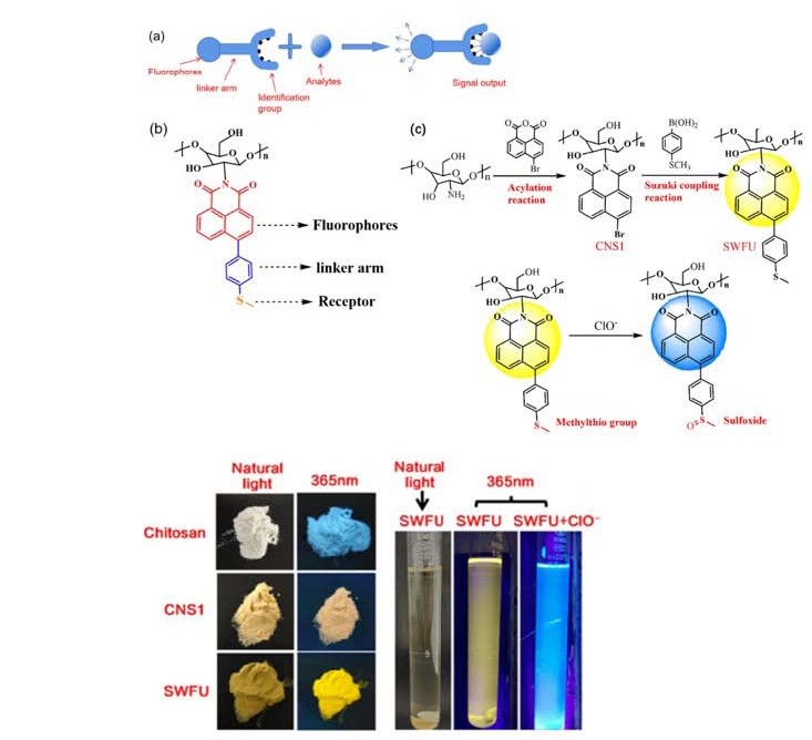 近日,suncitygroup太阳集团网站材料科学与工程专业2018级本科生胡能仙同学以第一作者在Elsevier旗下期刊Materials Today Chemistry杂志(IF:7.613)上发表“壳聚糖基荧光探针的制备及其在次氯酸盐检测中的应用” (The preparation of a chitosan-based novel fluorescent macromolecular probe and its application in the detection of hypochlorite)的相关研究工作。该工作以环境友好型天然高分子材料壳聚糖为原料,通过酰化反应和Suzuki偶联反应快速制备一种对次氯酸盐具有高灵敏度和选择性的新型荧光探针SWFU功能材料。该荧光探针在 ClO–检测中具有良好的选择性和抗干扰性能。论文链接https://doi.org/10.1016/j.mtchem.2023.101420。