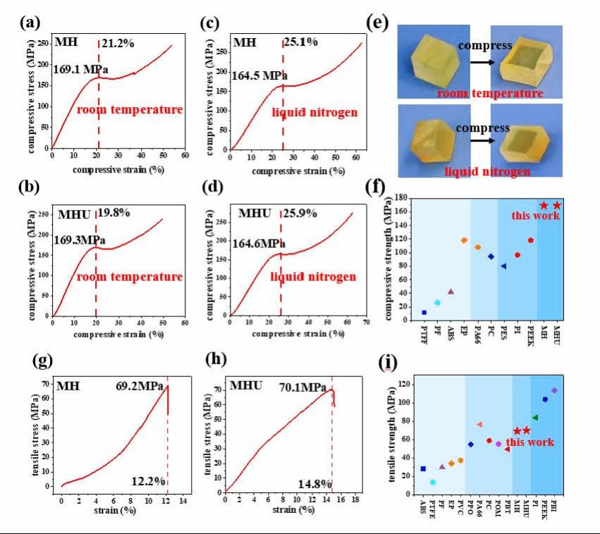 既“强”又“韧”是工程材料追求的终极目标。热塑性树脂往往是“韧”而不“强”,而热固性树脂则是“强”而不“韧”,两种性质的对立始终是树脂材料设计的巨大挑战。团队开发的新型热固性树脂很大程度上实现了两者的统一,在具有高强度的同时展现出优异的塑性,最难得的是,在超低温(-196℃)条件下,其力学性能与室温的力学性能相当。当树脂作为结构胶黏剂使用时,粘接钢、铝、铜、玻璃、碳纤维复合材料等界面的强度高达15~25MPa,其高温和超低温粘接性能可与商业化环氧树脂和聚氨酯树脂媲美。超强的胶合强度表明树脂对各种材料具有优良的界面相融性,是制备复合材料的理想基体树脂。