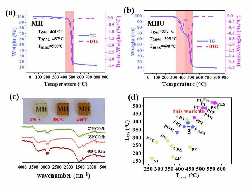 以聚酰亚胺为代表的耐受极端温度的(超)高性能树脂在高科技领域具有重要的应用,商业化后的价格高达数十万至数百万元每吨,昂贵的价格限制了其在更广阔领域的应用。团队经过两年多的筛选探索,实现了以廉价的三聚氰胺、己二胺和尿素为单体,通过简便的合成路线成功得到两种全新的高性能热固性树脂,同时创建了树脂的加工成型工艺。高度稳定的化学结构和刚-柔结合的交联网络赋予树脂出色的热稳定性,其中两组分树脂的热分解温度(T5%)高达460℃,最大分解温度(Tmax)更是高达500℃,可与商业化高性能树脂媲美。