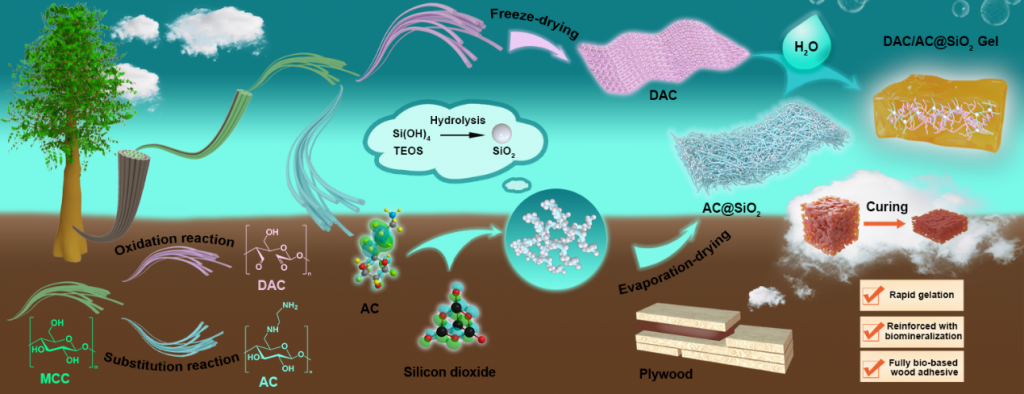 近日,公司生物质材料国际联合研究中心杜官本教授、杨龙研究员和冉鑫副研究员合作提出通过”缠结交联+生物矿化+快速凝胶”创新策略和思路,开发了一种全生物基纳米纤维素粘合剂。相关研究成果发表在化工领域国际权威期刊《Chemical Engineering Journal》(一区TOP,IF=16.7)上。题为Cross-linked entanglement of aldehyde and amine-functionalized nanocellulose reinforced with biomineralization to produce an all-bio-based adhesive,第一作者为杨龙研究员课题组2020级硕士研究生倪科路同学。