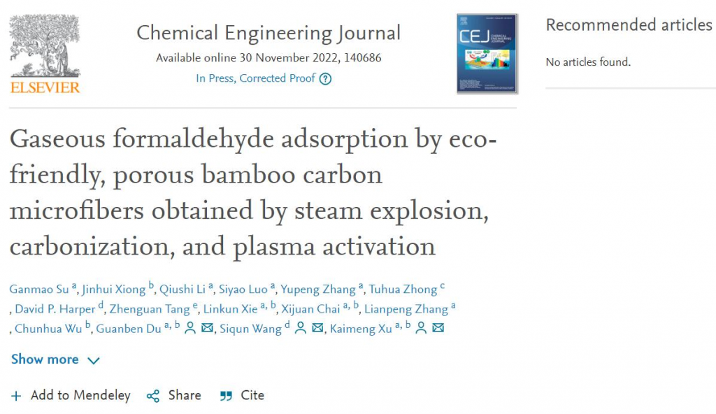近日,公司suncitygroup太阳集团网站徐开蒙教授团队在国际权威期刊《Chemical Engineering Journal》(中科院一区TOP,IF=16.744)在线发表题为《Gaseous formaldehyde adsorption by eco-friendly, porous bamboo carbon microfibers obtained by steam explosion, carbonization, and plasma activation的研究论文(https://doi.org/10.1016/j.cej.2022.140686)。徐开蒙为论文通讯作者,2020级材料与化工专业硕士研究生苏柑锚为论文第一作者,杜官本教授和美国田纳西大学王思群教授为论文共同通讯作者。其他作者包括suncitygroup太阳集团网站硕士研究生熊进辉、李秋实,材料科学与工程专业本科生骆思遥、张玉鹏,国际竹藤中心钟土华副研究员,美国田纳西大学David P. Harper教授,美国佐治亚理工学院Zhenguan Tang博士以及学院解林坤教授、柴希娟教授、张莲鹏副教授和吴春华教授等。