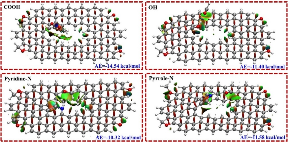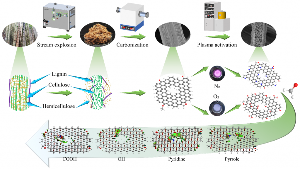 该工作首次利用蒸汽爆破、高温碳化和射频等离子体协同改性的方法对云南特色竹种—巨龙竹进行处理,制备了对室内有害甲醛气体具有高效选择性吸附能力的多孔竹碳微米纤维。在最优协同处理条件下,竹碳微米纤维对甲醛的吸附量可达205.28mg/g,远高于传统的竹炭、竹活性炭、商业活性炭以及其他通过化学湿法改性制备的生物质基活性炭。结合密度泛函理论计算揭示了O–C=O和pyrrolic N两种最优含氧含氮官能团对甲醛分子吸附的增效机理。该工作提出的多孔竹碳微米纤维制备工艺简单、成本低廉、绿色环保,为国家和云南省竹木资源的高值化开发利用提供了新思路与新途径,具有巨大的市场推广和应用潜力,是林业工程学科对国家“双碳”战略和云南省“生态文明排头兵建设”的重要支撑。