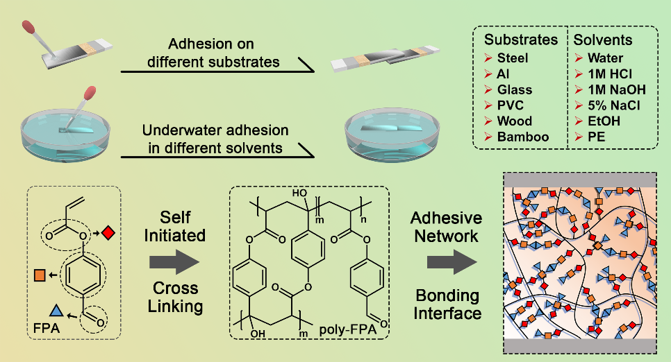 进展一,利用一步法制备了在多种基材以及水环境下具有高粘接强度的水下胶黏剂p-formylphenyl acrylate ,且实现了在酸性、碱性和模拟海水等水环境下的高强度粘接。FPA通过自身醛基诱导空中氧气产生氧自由基引发烯烃聚合为poly-FPA,使得胶黏剂在无需加热、光照、催化剂和固化剂等条件下即可进行自引发固化,并深入研究了醛基诱导氧自由基引发烯烃聚合的反应机理以及在多种基材和水环境下的粘接强度。相关成果以“High-Strength, Self-Initiated, Wide pH Range of Underwater Adhesive Suitable for Different Severe Environments”为题发表在化工领域著名期刊Chemical Engineering Journal(一区top,IF:16.744)上。论文的通讯作者为杨龙研究员、杜官本教授和周备助理研究员,第一作者为杨龙研究员课题组2019级硕士研究生任俊宇同学。云南大学刘畅博士通过DFT理论计算模拟对poly-FPA胶黏剂与基材之间的黏附模式及黏附机理进行了研究,该研究工作与周备博士课题组合作完成,周备博士课题组通过自由基捕获实验对烯烃聚合机理进行了深入研究。