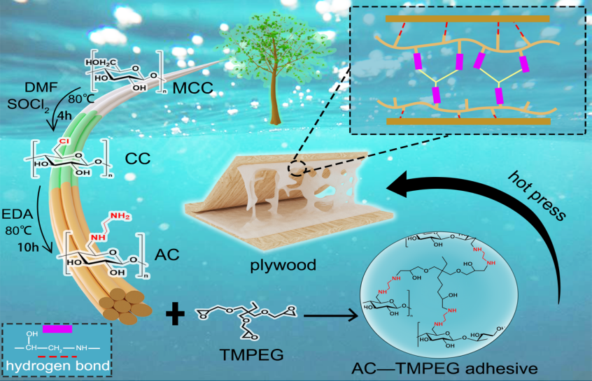进展四,醛类树脂胶黏剂在目前胶黏剂市场中占据着重要的地位,然而该类胶黏剂在原料上过度依赖化石资源,并且在使用过程中会释放挥发性有机污染物如甲醛、苯酚等,会对环境和人体造成一定的危害。随着人类对环境污染和身心健康的日益关注,推动环境友好、可再生、可持续、性能良好的生物质基胶黏剂的发展是未来木材胶黏剂行业发展的必然趋势。在众多生物质资源中,纤维素因其在自然界中丰富的储量脱颖而出。基于上述研究背景,杜官本/杨龙课题组聚焦纤维素的官能化改性,通过构建交联网络的研究思路,开发了纤维素基木材胶黏剂,为无甲醛生物基木材胶黏剂的开发提供了快速有效的新途径。相关成果以“Functionalization of cellulose with amine group and cross-linked with branched epoxy to construct high-performance wood adhesive”为题发表在一区Top期刊International Journal of Biological Macromolecules,2022,222,2719-2728(IF:8.025)上。第一作者为2021级硕士研究生袁佳凤,通讯作者为杨龙研究员、杜官本教授和李君副教授。