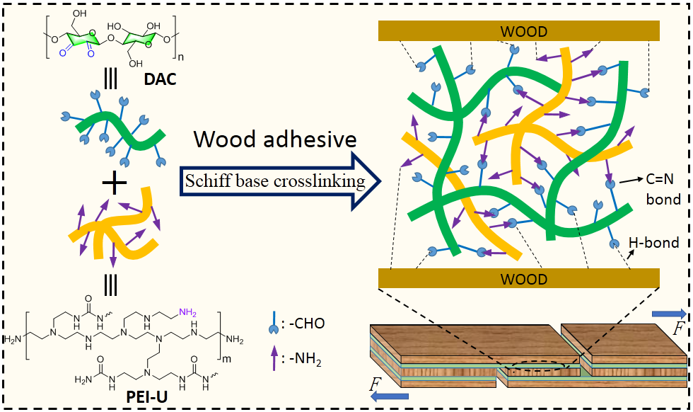 进展五,生物基胶粘剂因其来源广泛、成本低和可持续而被认为是甲醛系列木材胶粘剂的主要替代品。基于课题组前期研究工作(ACS Sustainable Chem. Eng. 2021,9,16849-16861;ACS Appl. Polym. Mater. 2021,3,1638-1651;ACS Sustainable Chem. Eng. 2020, 8, 5209-5216)。本研究成功制备了一种由聚乙烯亚胺(PEI)、尿素和纤维素为原料合成的环境友好型席夫碱交联生物基胶黏剂(DAC-PEI-U)。研究结果表明,DAC-PEI-U胶粘剂的干粘接强度达到2.71 MPa,湿剪切强度分别为1.51 MPa(热水)和1.34 MPa(沸水)。该工作不仅提高了纤维素胶黏剂的耐水性和改善了聚脲胶黏剂胶合工艺,而且合成简单。相关成果以“Construction of a cellulose-based high-performance adhesive with a crosslinking structure bridged by Schiff base and ureido groups”为题发表在一区Top期刊International Journal of Biological Macromolecules,2022,223,971-979(IF:8.025)上。第一作者为2022级博士研究生李智,论文的通讯作者为杨龙研究员、冉鑫副研究员和杜官本教授。