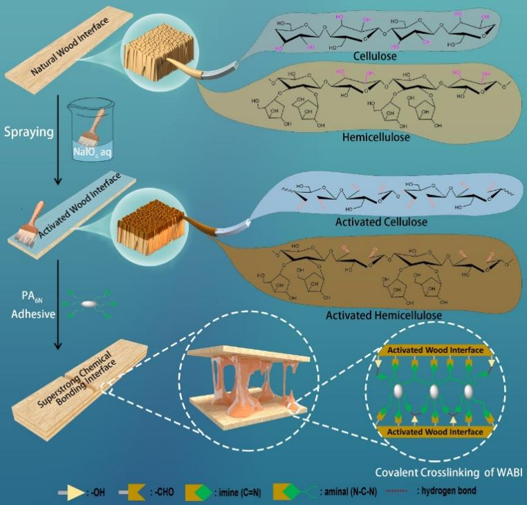 进展三,木基复合材料是一种自然设计和优化的环保材料,具有良好的机械强度。木制品被广泛应用于日常生活和工业生产中。高质量木材基复合材料中不可或缺且非常重要的就是要有优异的胶合性能。寻求开发无甲醛且超强的胶合性能已经成为该领域的热门问题。基于上述研究背景,杜官本/杨龙团队通过对木材界面进行醛基官能团定制,进而与氨基胶粘剂形成化学键交联,开发出了远超国家标准一类胶合板的要求的胶合板,并对胶合界面重构机理进行了阐述。相关成果以Novel ultrastrong wood bonding interface through chemical covalent crosslinking of aldehyde-amine为题发表在一区Top期刊Industrial Crops & Products,2022, 189, 115800(IF:6.449)。第一作者为2020级硕士研究生苏航,通讯作者为杨龙研究员和杜官本教授。