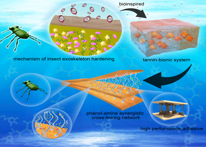 进展二,当前木材工业使用的胶黏剂主要由石油基脲醛树脂、酚醛树脂和三聚氰胺-甲醛树脂生产,而其制造与使用过程中甲醛的释放与可持续、环保、健康的发展战略背道而驰。开发高性能、环境友好、对人体健康、服务双碳战略的木材胶黏剂是工程应用和技术领域的挑战之一。基于上述需求,杜官本/杨龙团队受昆虫表皮外骨骼硬化机制衍生的“酚胺协同”策略和海星结构启发,利用天然多酚单宁酸和富氨基聚合物支化多胺之间的共价化学交联反应(席夫碱和迈克尔加成反应)以及多重非共价作用力,形成三维致密“酚胺协同”交联网络,制备的单宁基木材胶黏剂具有优异的胶合性能和耐水性能。相关成果以“H2O2-mediated tannin bio-based wood adhesive inspired by starfish structure and phenol-amine synergy”为题发表在一区Top期刊Industrial Crops & Products上,2022,188,115714(IF:6.449)。第一作者为2020级硕士研究生刘思辰和武映辰,通讯作者为杨龙研究员和杜官本教授。